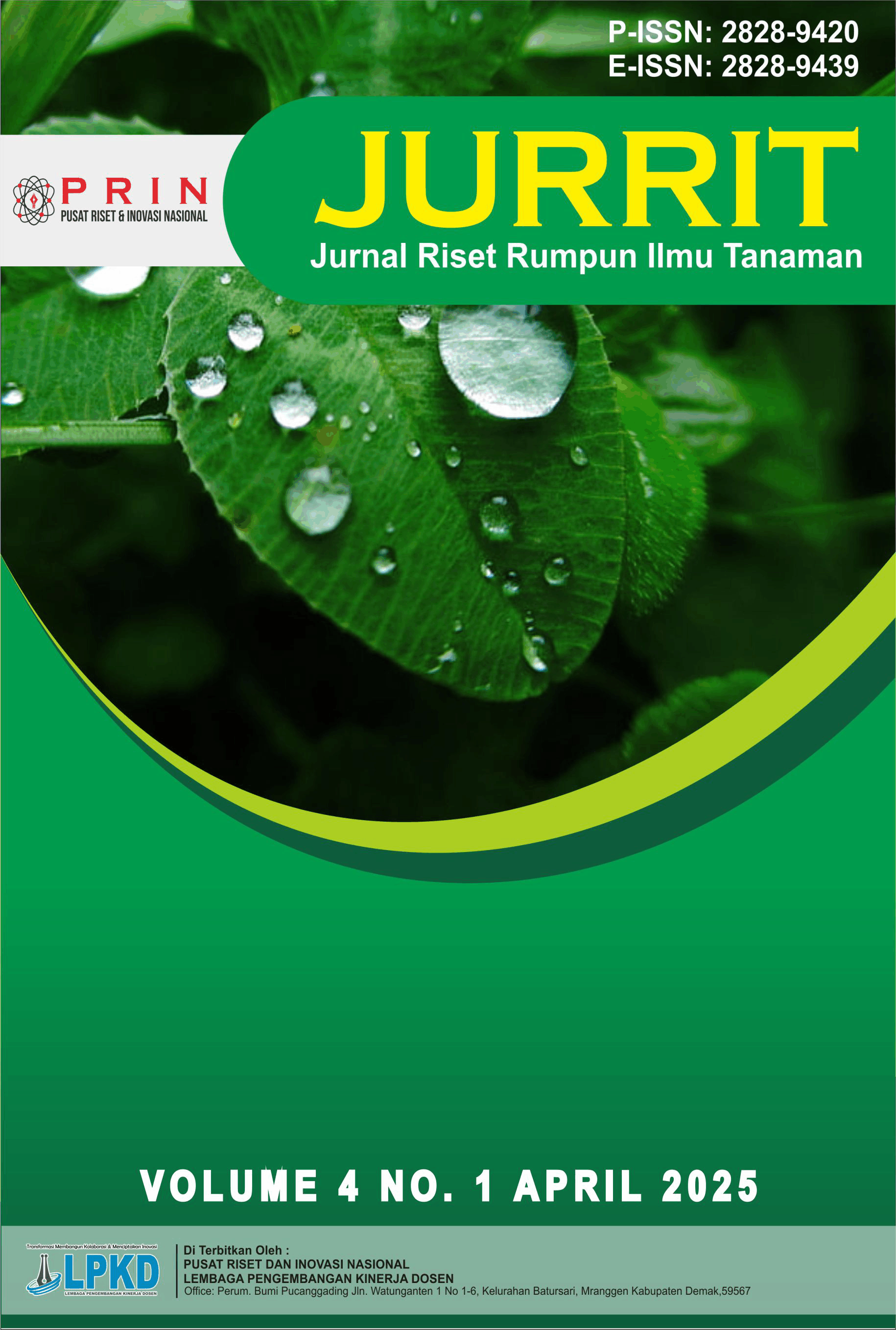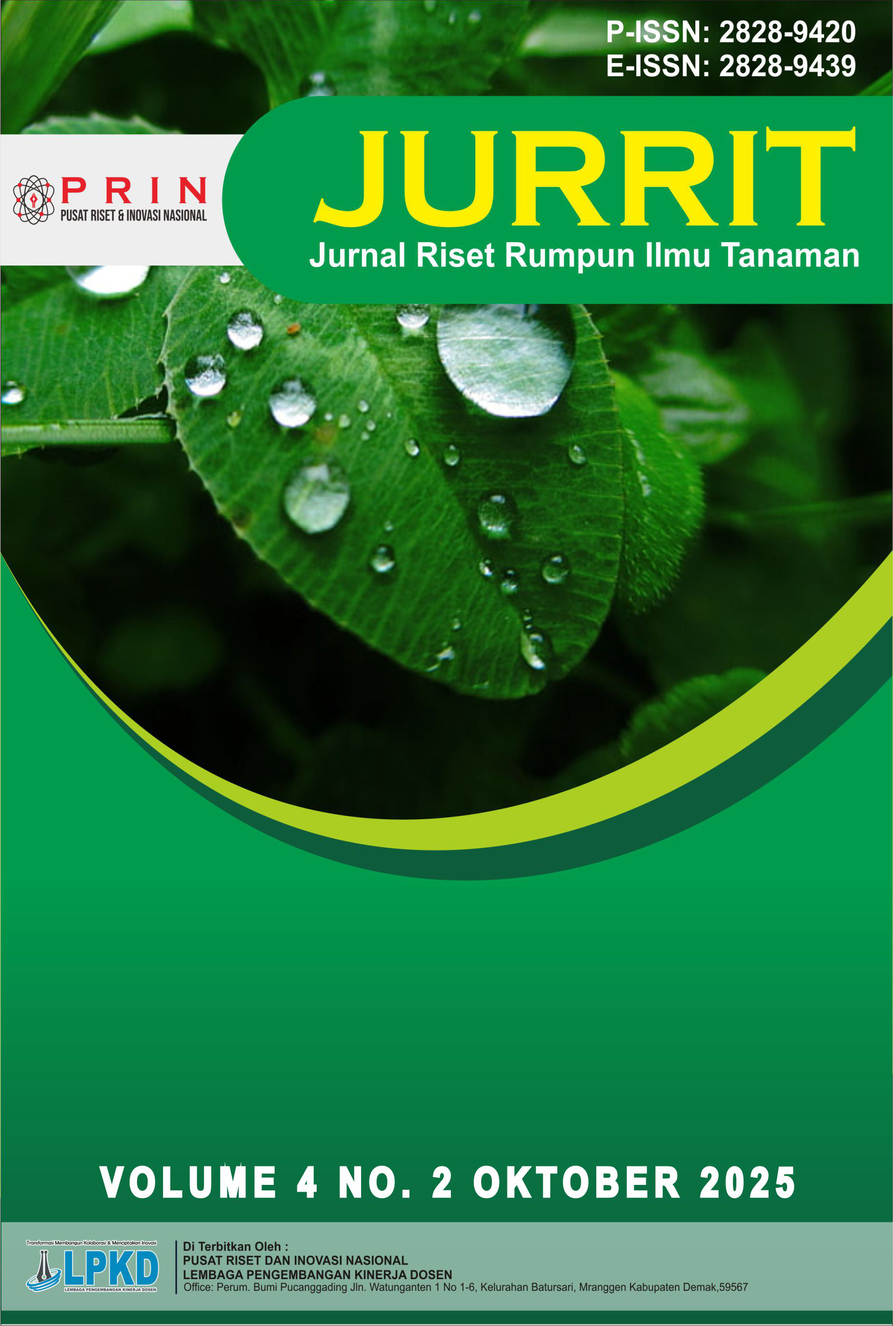 Vol. 5 No. 1 (2026)JURRIT: Jurnal Riset Rumpun Ilmu Tanaman: ISSN: 2828-9420 (cetak), ISSN: 2828-9439 (online) adalah jurnal yang ditujukan untuk publikasi artikel ilmiah yang diterbitkan oleh Pusat riset dan Inovasi Nasional, Lembaga Pengembangan Kinerja Dosen. Jurnal ini adalah jurnal Riset Rumpun Ilmu Tanaman yang bersifat peer-review dan terbuka. Bidang kajian dalam jurnal ini termasuk sub rumpun Ilmu Pertanian dan Perkebunan, Ilmu Sosiologi Pertanian, Ilmu Kehutanan. Jurnal Riset Rumpun Ilmu Tanaman menerima artikel dalam bahasa Inggris dan bahasa Indonesia dan diterbitkan 2 kali setahun: April dan Oktober.