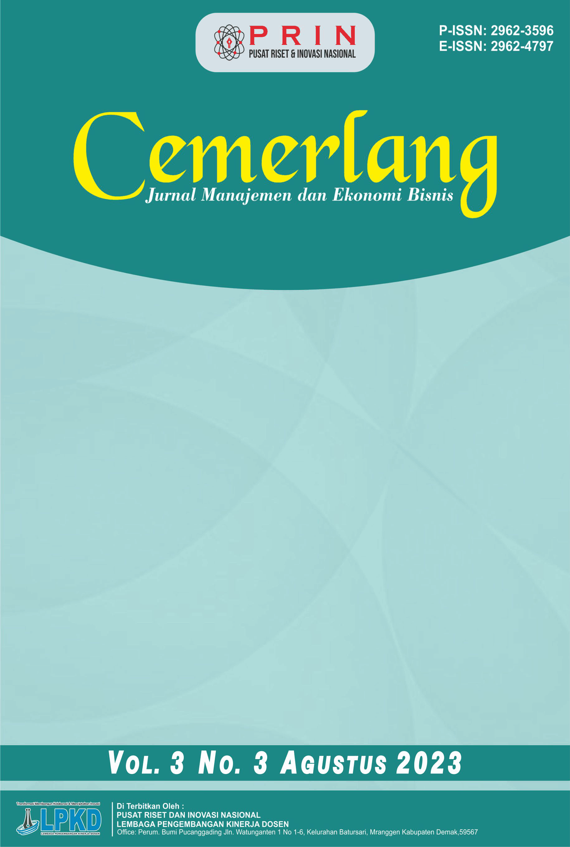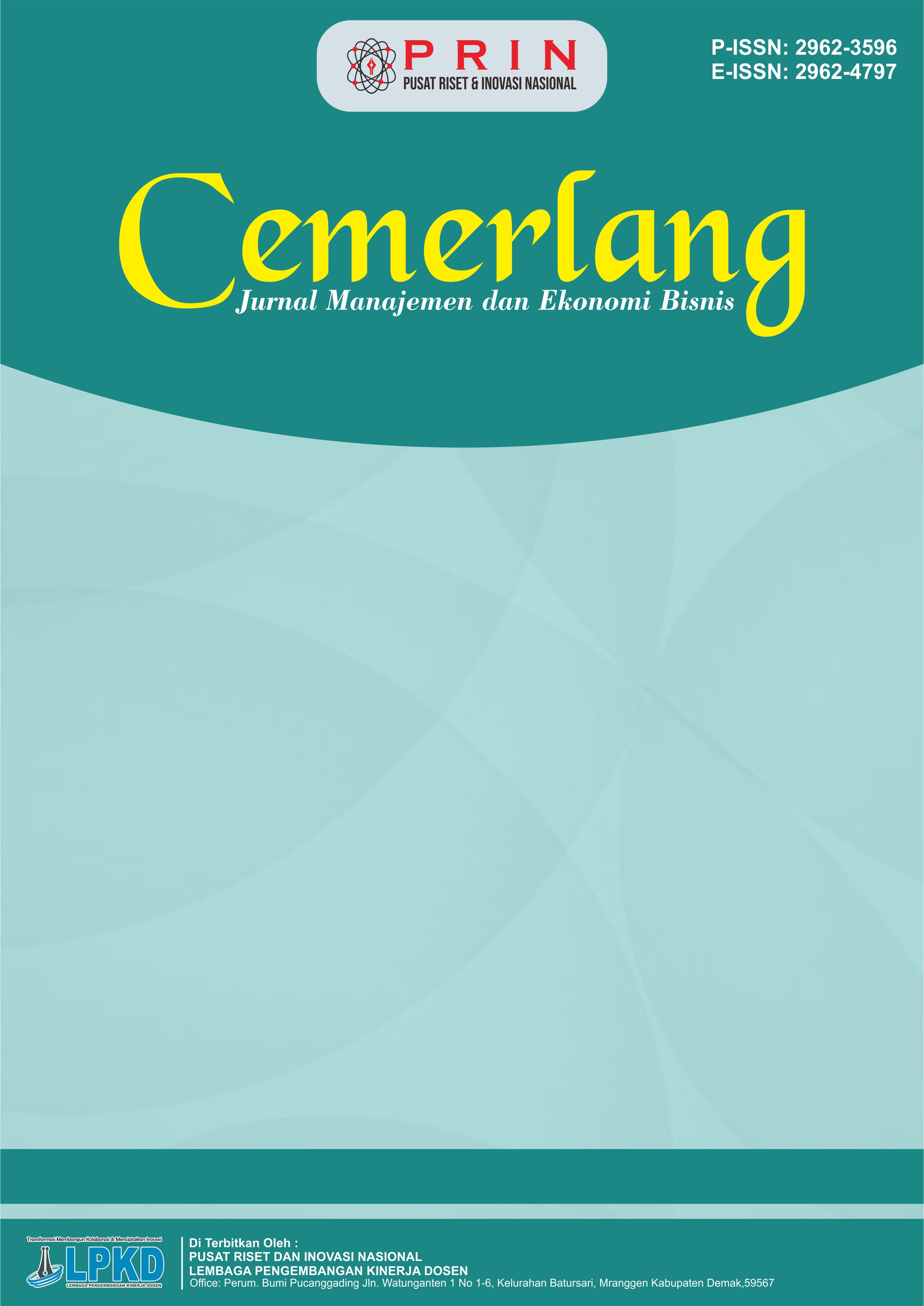 Vol. 4 No. 2 (2024)CEMERLANG :Jurnal Manajemen dan Ekonomi Bisnis : ISSN: 2962-3596 (cetak), ISSN: 2962-4797 (Online) berfokus pada penerbitan artikel berkualitas tinggi yang didedikasikan untuk semua aspek penelitian, masalah, dan perkembangan terbaru di bidang Ilmu Manajemen. Topik dalam Jurnal ini berkaitan dengan aspek apapun dari manajemen, namun tidak terbatas pada topik berikut : Manajemen Sumberdaya Manusia , Manajemen Keuangan, Manajemen Pemasaran, Manajemen Sektor Publik, Manajemen Operasional, Manajemen Rantai Pasokan, Corporate Governance, Etika Bisnis, Akuntansi Manajemen dan Pasar Modal dan Investasi. Jurnal ini terbit 1 tahun 4 kali (Februari, Mei, Agustus dan November)