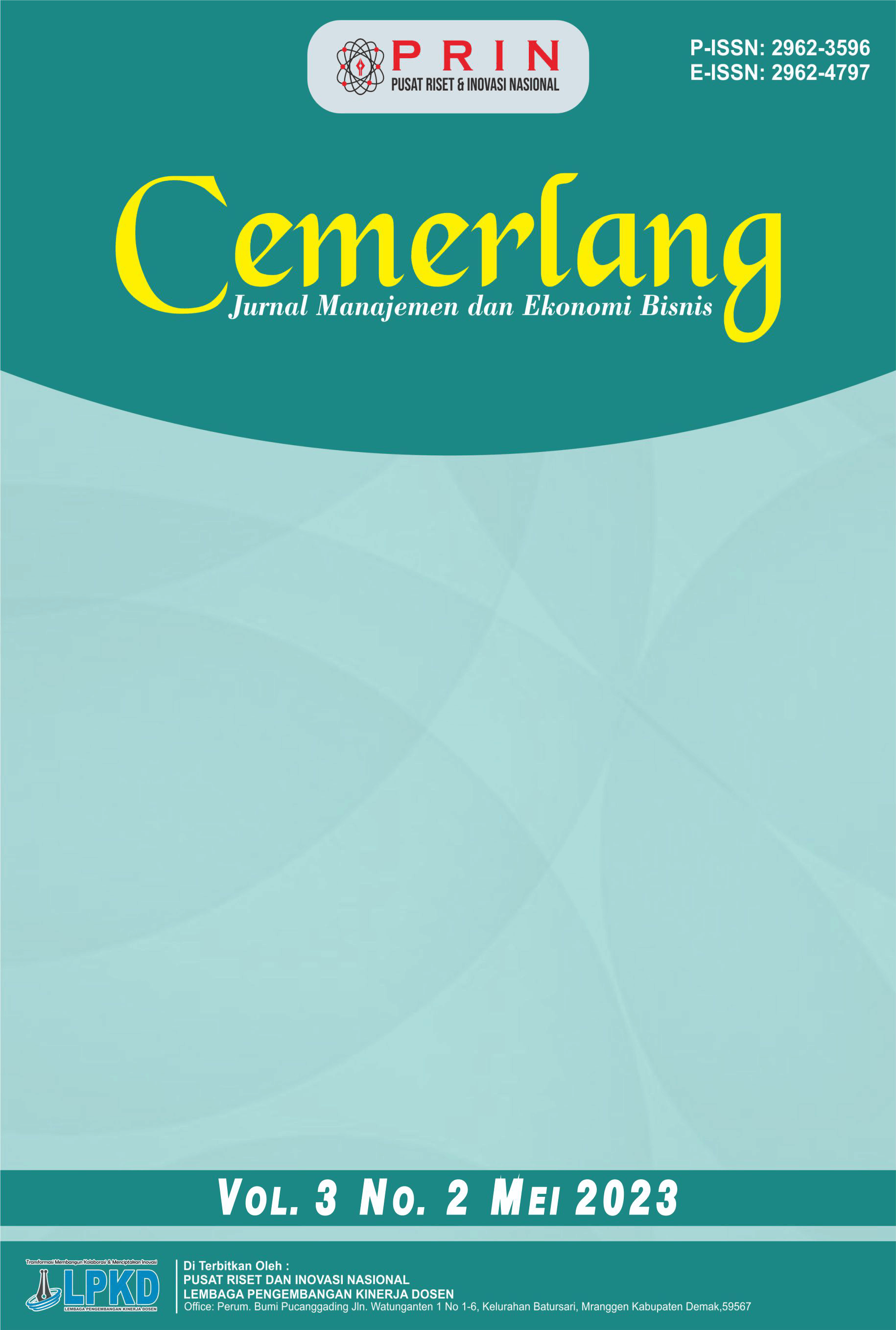 Vol. 2 No. 2 (2022)CEMERLANG :Jurnal Manajemen dan Ekonomi Bisnis : ISSN: 2962-3596 (cetak), ISSN: 2962-4797 (Online) berfokus pada penerbitan artikel berkualitas tinggi yang didedikasikan untuk semua aspek penelitian, masalah, dan perkembangan terbaru di bidang Ilmu Manajemen. Topik dalam Jurnal ini berkaitan dengan aspek apapun dari manajemen, namun tidak terbatas pada topik berikut : Manajemen Sumberdaya Manusia , Manajemen Keuangan, Manajemen Pemasaran, Manajemen Sektor Publik, Manajemen Operasional, Manajemen Rantai Pasokan, Corporate Governance, Etika Bisnis, Akuntansi Manajemen dan Pasar Modal dan Investasi. Jurnal ini terbit 1 tahun 4 kali (Februari, Mei, Agustus dan November)